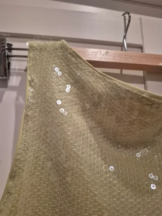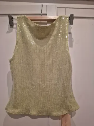 Elegante top de Mango con un diseño brillante de lentejuelas. Ideal para ocasiones especiales. Usado en una ocasión. - Diseño degradado de lentejuelas plateadas y doradas. - Tirantes finos. - Corte recto.