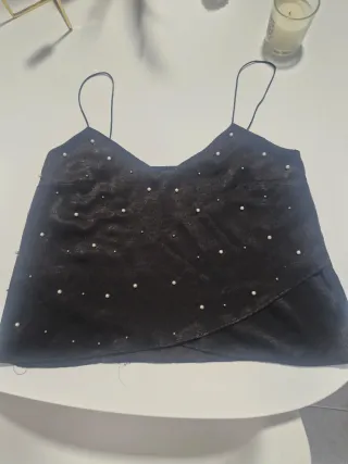 Elegante top de Zara con un diseño llamativo. - Tejido de terciopelo negro. - Adornado con pequeños detalles brillantes. - Corte tipo corpiño.