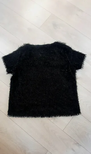 Camiseta negra de talla XXL (equivalente a 44-46). Es una prenda elegante y cómoda, ideal para cualquier ocasión. - Tiene un diseño elegante y sofisticado. - Tejido elástico decorado con brillos del mismo color. - Ideal para ocasiones especiales o para el día a día. - En perfecto estado. Medidas: Largo 55cm Ancho de sisa a sisa 52cm Cintura 48cm Hago envío, también se puede recoger en calle Jaime el Conquistador (28045, cerca de los metros Legazpi y Delicias).