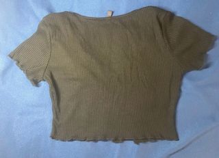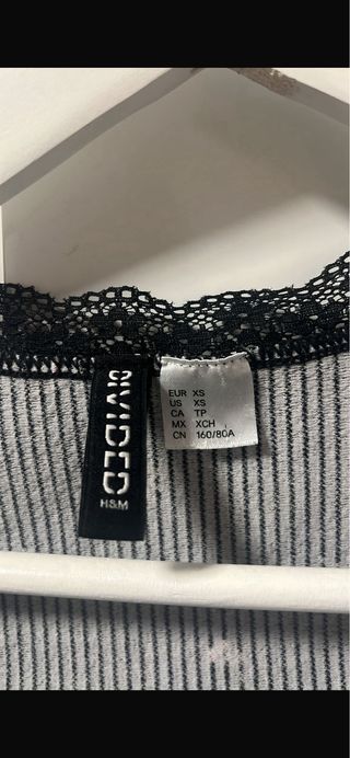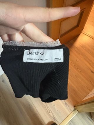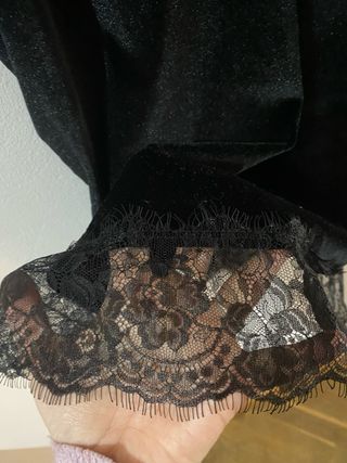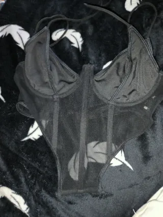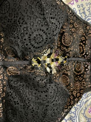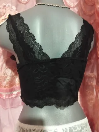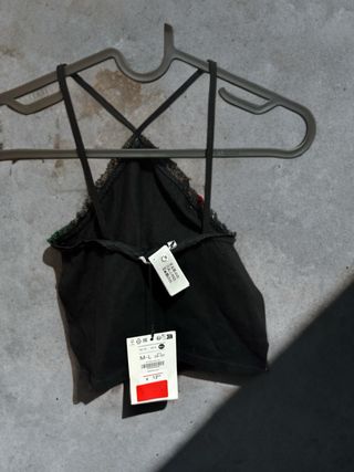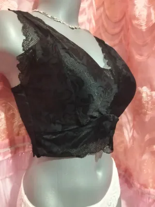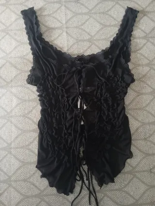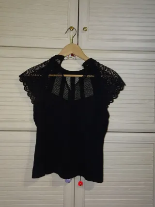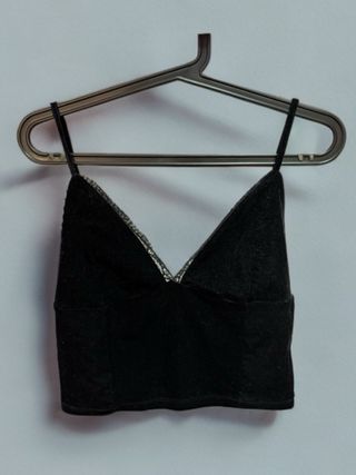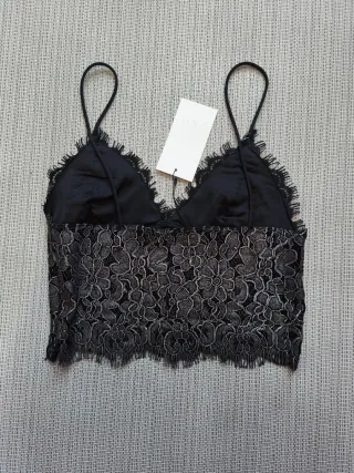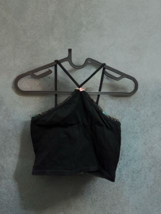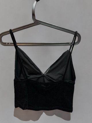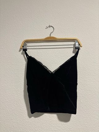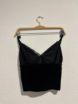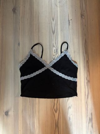 Es un top corto. Usado una vez. Es de color negro. Tiene encaje por la zona del escote, como se ve en la foto.
