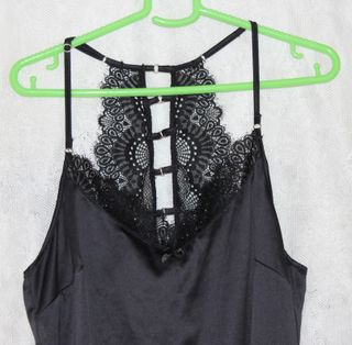 Este top lencero presenta un diseño elegante con detalles de encaje. - Tirantes finos ajustables. - Escote en V con detalle de encaje. - Aberturas en la parte trasera con adornos metálicos.