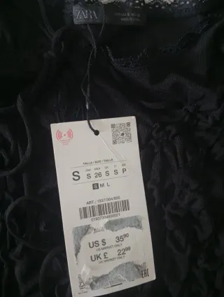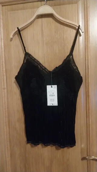 Elegante top negro de Zara con detalles de encaje. - Tirantes finos ajustables. - Adorno de encaje en el escote. - Tejido ligero y fluido.