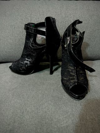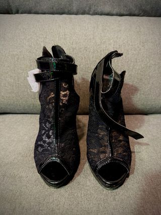 Elegantes botines de tacón con un diseño de encaje y detalles en charol. - Material: Encaje y charol. - Color: Negro. - Estilo: Botín peep-toe con tiras. -Sin estrenar