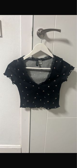 Bonito top corto de H&M con un diseño floral discreto y detalles de encaje. - Manga corta. - Escote en V. - Ribete festoneado en mangas y bajo.