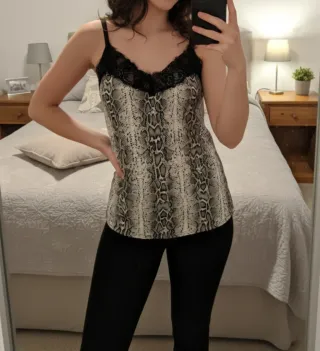 Añade un toque atrevido a tus noches con este top de estampado de serpiente en tonos tierra y beige. El detalle de encaje negro en el escote lo hace súper femenino y elegante. Estado: Muy bueno, solo tiene un par de usos. Talla: L (40/12). Combinación: Queda increíble con una blazer negra y unos jeans o pantalones de cuero. ¡Una prenda tendencia por solo 1€!