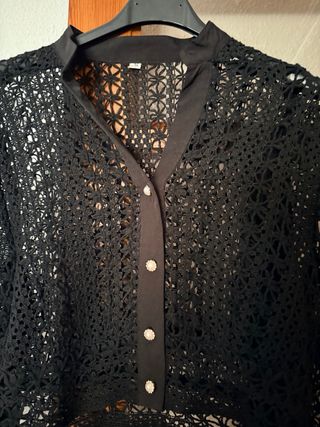 Precioso top negro de Stradivarius con un diseño de encaje calado. Es talla M pero más bien se acera a una S. - Manga larga. - Escote redondo. - Tejido calado con motivos florales.