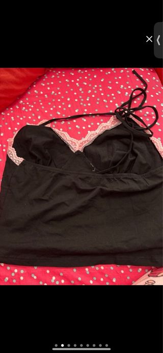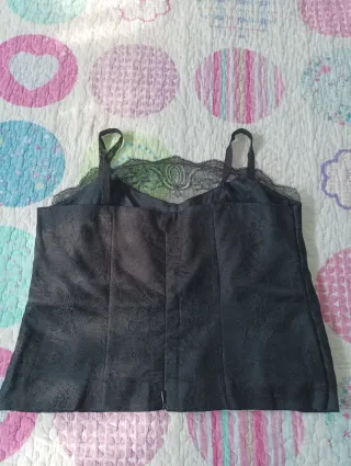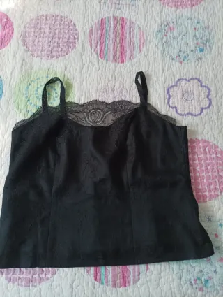 Precioso top negro con detalles de encaje y tejido de lycra. - Diseño con tirantes anchos. - Acabado con puntilla en el escote. - Tejido elástico y cómodo. A QUIÉN LE INTERESE QUE ME ENVÍE UN MENSAJE X AQUÍ.GRACIAS.