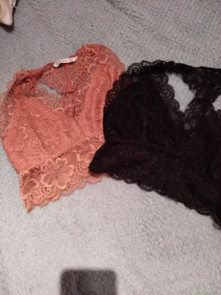 Precio x los 2. Conjunto de dos tops de encaje con un diseño delicado y femenino. En la zona del pecho, con forro. Escote en 3spalda "tipo nadador". - Uno de los tops es de color anaranjado. - El otro top es de color negro. - Ambos son de talla M. y presentan un bonito borde festoneado.