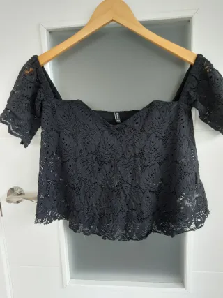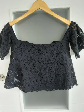 Crop top negro de encaje. De la firma Stradivarius, talla M. Es un diseño elegante y favorecedor. - Escote hombros caídos. - Manga corta. - Sin usar. Hago envíos, también se puede recoger en calle Jaime el Conquistador (28045, cerca de los metros Legazpi y Delicias).