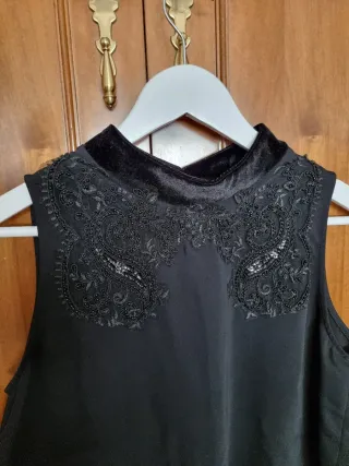 Elegante top de Zara con etiqueta, perfecto para cualquier ocasión. - Diseño sin mangas. - Cuello alto con detalle de terciopelo y pedrería. - Cierre de botón en la nuca. - Adorno de encaje y pedrería en la parte delantera.