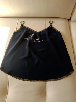 Elegante top lencero azul marino y encaje negro con un delicado bordado. Estado impecable. Talla S - Diseño con tirantes finos ajustables. - Detalle de encaje en el escote. - Bordado love is en hilo blanco. - Pequeña estrella bordada.