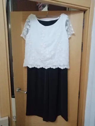 Elegante conjunto de top blanco con detalles de encaje y pantalón negro. - Top con mangas cortas de encaje. - Escote redondo. - Pantalón de corte recto.
