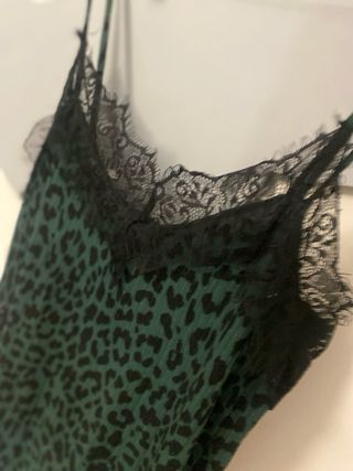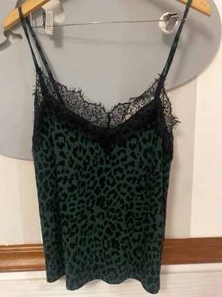 Camiseta tono verde animal print con encaje negro en el escote y tirantes . Talla XS amplia