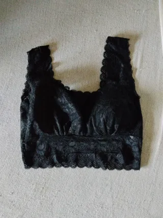 Este top negro de encaje es una prenda elegante y versátil. - Diseño con tirantes finos. - Tejido de encaje floral. - Corte tipo bustier.
