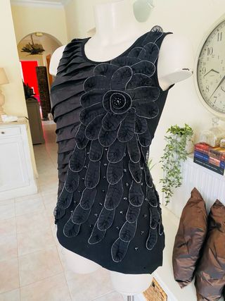 Elegante top negra con espectacular aplicación floral en relieve y pequeños detalles brillantes. Diseño asimétrico con pliegues que crea un efecto muy sofisticado y original. Perfecta para fiestas, eventos o looks de noche. La flor grande hace que la prenda sea muy llamativa y especial. • Marca: Boske • Talla: M/L • Color: negro • Buen estado • Etiqueta de material no presente Una prenda muy elegante con estilo tipo diseñador.