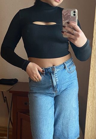 Top negro de manga larga con un diseño moderno y atrevido. Su tejido acanalado se ajusta al cuerpo. - Cuello alto. - Abertura en la zona del pecho. - Corte cropped.