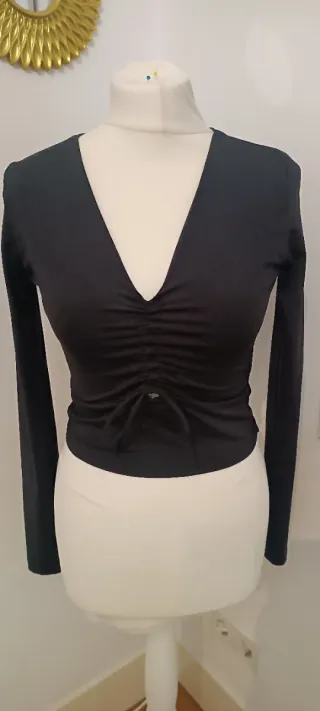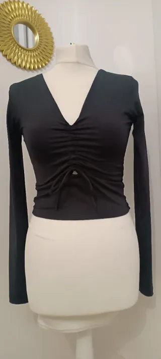 Top de Stradivarius con un diseño moderno y favorecedor.Sienta como un guante, sirve para S y M pq se adapta Está genial, puesto solo un par de veces - Escote en pico. - Detalle fruncido central. - Cordón ajustable en la parte delantera. - Mangas largas.