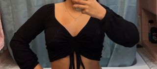 Crop top con un diseño moderno y favorecedor. - Escote pronunciado. - Mangas largas. - Detalle de fruncido y tiras ajustables en la parte delantera.