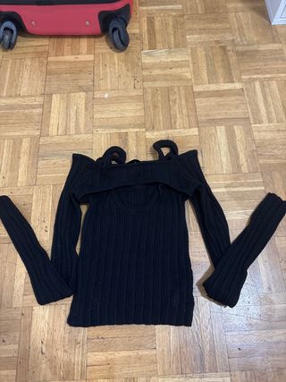 Top negro de manga larga con diseño cut-out. - Escote Bardot. - Mangas largas. - Aberturas en el torso.