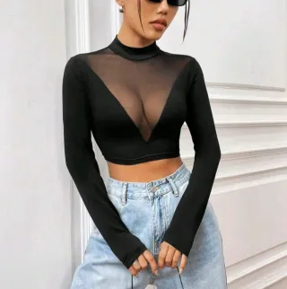 Este top negro presenta un diseño moderno y atrevido. - Mangas largas. - Escote pronunciado en V con detalle de transparencia. - Corte crop.