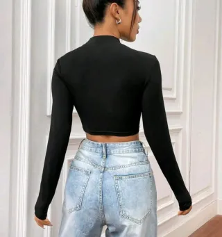 Top negro de manga larga con corte crop. - Diseño moderno y versátil. - Tejido suave y cómodo.