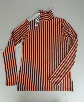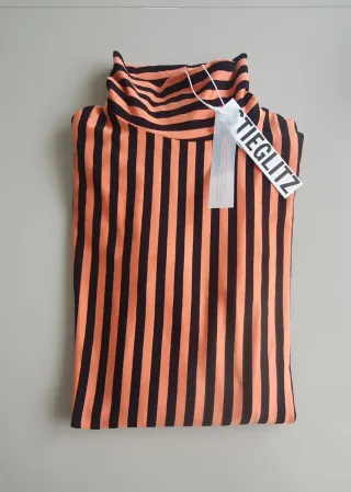 Top de manga larga con cuello alto de la firma STIEGLITZ. - Diseño de rayas verticales en color negro y naranja. - Nuevo sin estrenar, con etiqueta. - Es slim fit, elástico. - Talla XL. Yo utilizo una 40 y me está bien, ceñida, ajustada pero no prieta. - Medidas: 37cm de hombros, 44cm de sisa y 68cm de largo desde el hombro. - Composición: 98% viscosa y 2% elastán.