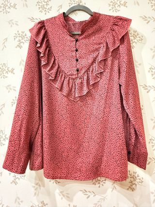 Camisa rosa de volantes con topos negros