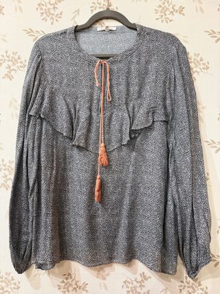 Blusa elegante con un estampado de topos negros sobre fondo gris. Presenta un detalle de volantes en la parte delantera y un cordón con borlas para anudar. - Manga larga. - Cuello redondo. - Cierre con cordón y borlas.