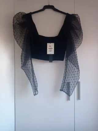 Elegante top de Zara con manga larga. - Diseño crop top. - Escote pronunciado con encaje. - Cierre de lazo en la espalda. - Mangas abullonadas con puño elástico.