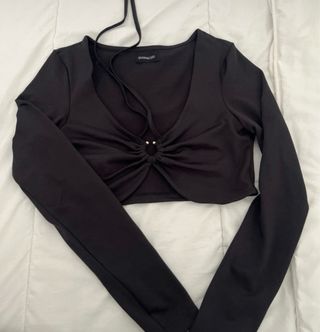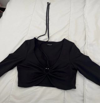 Top negro de manga larga con un diseño de escote pronunciado, detalle de anilla metálica y lazos para anudar. Apenas usado