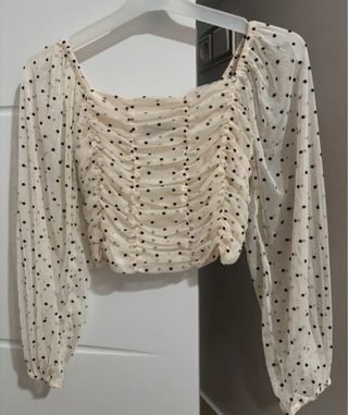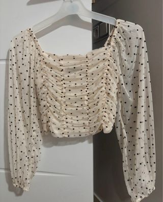 Top con mangas transparentes y estampado de lunares. El diseño presenta un escote cuadrado y fruncido en la parte delantera. - Mangas largas y transparentes. - Estampado de lunares negros y grises sobre fondo beige. - Diseño fruncido en el torso.