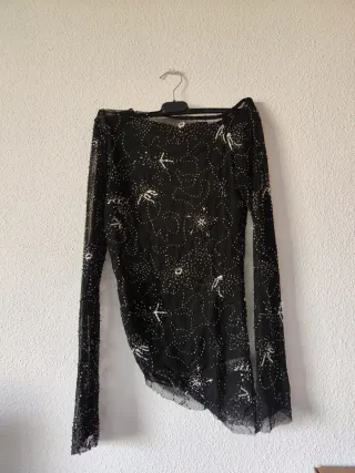 Elegante top de manga larga con un intrincado diseño de pedrería plateada. - Tejido semitransparente. - Adornos de pedrería y lentejuelas. - Diseño asimétrico en el bajo.