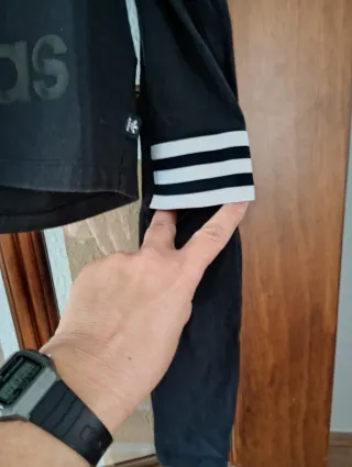 Camiseta deportiva Adidas de manga larga, estilo crop top. - Diseño con el icónico logo Trefoil de Adidas en el pecho. - Detalle de tres rayas blancas en los puños de las mangas. - Tejido suave y cómodo.