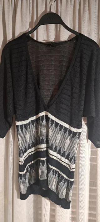 Elegante top de la colección Suit de mayor calidad de Mango con un diseño moderno y detalles brillantes. - Medidas: Ancho de axila a axila 40 ctms y Largo 68 ctms. - Favorecedor escote en V. - Tejido ligero con relieve de rayas en la parte superior. - Zona central con estampado geométrico en tonos plateados con hilo metalizado que no se aprecia bien en la fotografía y blancos. - Mangas cortas tipo murciélago.