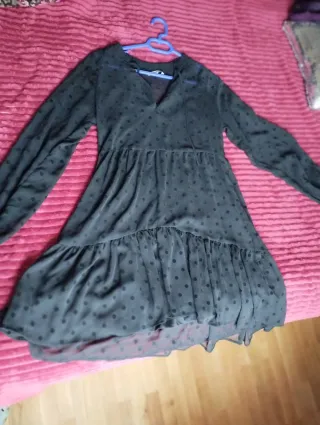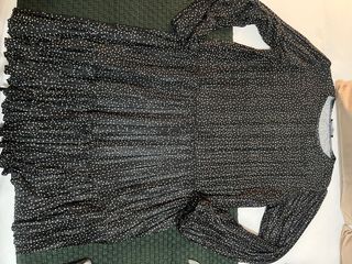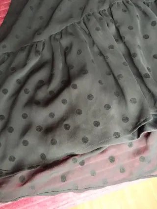 Elegante vestido negro con un delicado estampado de topos. - Diseño de manga larga. - Incluye cinturón a juego. - Escote con abertura. - Tejido semitransparente. -Pone talla 42 pero es talla pequeña