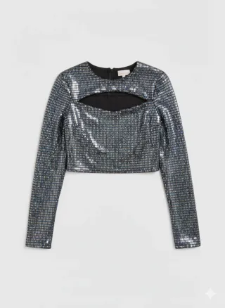 Top de manga larga con un diseño moderno y llamativo. - Acabado brillante con lentejuelas. - Corte crop top. - Escote con abertura frontal.