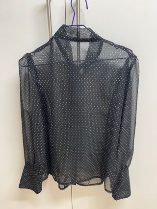 Blusa romántica talla S de Stradivarius. Color negro. Tejido semitransparente con estampado de topos. - Cuello con volantes. - Cierre de botones en la parte delantera. - Mangas largas abullonadas con puños elásticos.