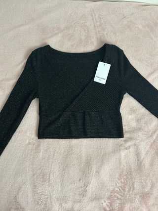 Top elegante de manga larga con un acabado brillante. Perfecto para ocasiones especiales. - Diseño cruzado. - Tejido elástico. - Corte crop.