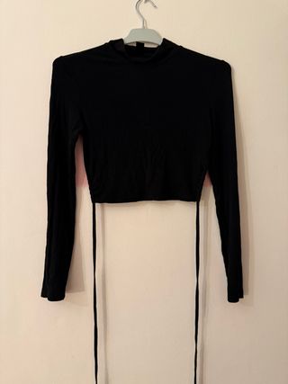 Top negro de manga larga con cuello alto y detalle de lazo en la espalda. - Diseño cropped. - Tejido suave y elástico.