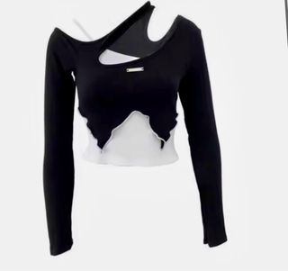Top de manga larga con un diseño asimétrico y moderno. La parte superior es negra y la inferior blanca, creando un contraste llamativo. - Diseño de corte irregular en el bajo. - Escote asimétrico. - Detalle metálico en la parte frontal.