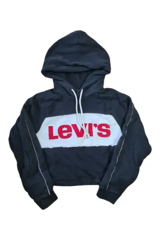 Sudadera corta oversize levi's talla xs. Estado: 9/10✨ Medidas 📏: 44 de largo y 47 de axila a axila. Envío: 24/48 horas de lunes a viernes 📦📦 Más ropa en mi perfil - Diseño frontal con panel blanco y logo. - Mangas largas. - Cordones blancos en la capucha.