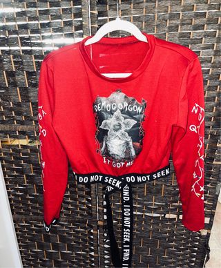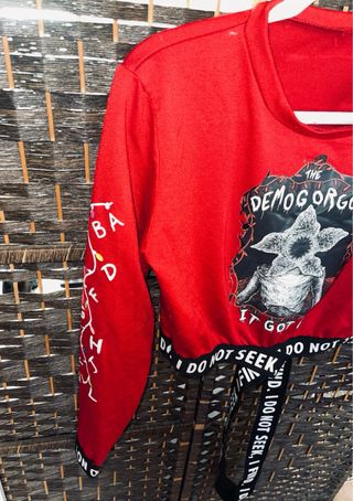 Camiseta crop top roja con estampado del Demogorgon de Stranger Things. Presenta un cinturón negro con el lema Do Not Seek, I Find. - Diseño inspirado en la serie Stranger Things. - Manga larga. - Cinturón con texto repetido.