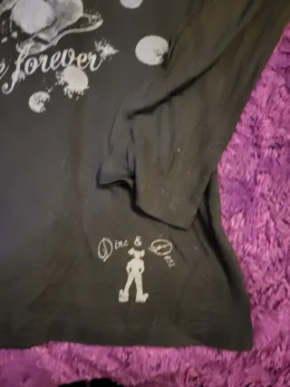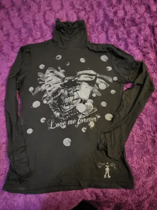 Este top de manga larga de Dina y Dess presenta un diseño llamativo con un corazón y un lazo. - Cuello alto fruncido. - Estampado frontal con Love me forever. - Detalles de lunares. - Pequeño estampado de figura en la parte inferior.