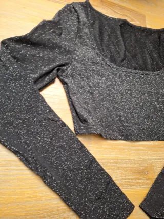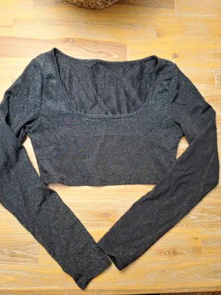 Top negro con un acabado brillante y detalles que destellan. - Diseño de manga larga. - Escote cuadrado. - Corte crop top.