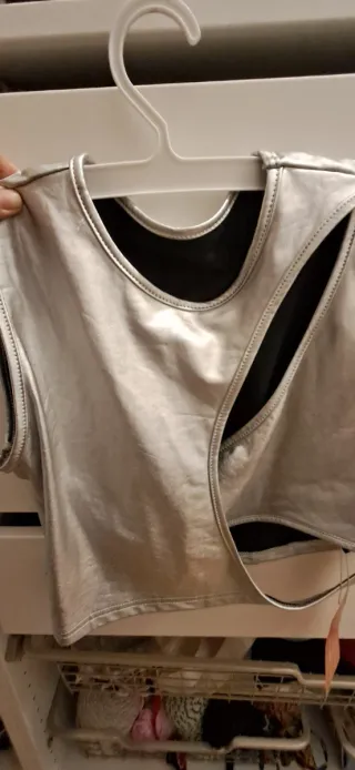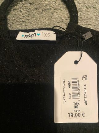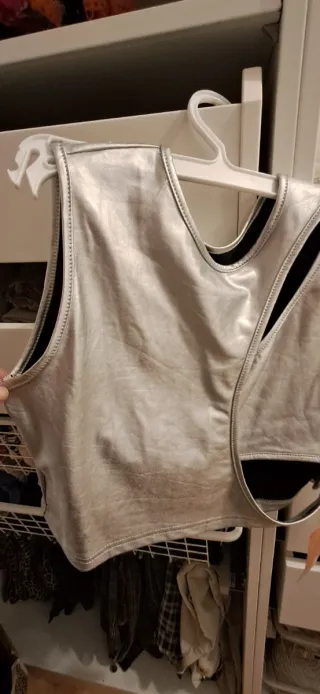 Top con acabado metálico brillante. - Diseño sin mangas. - Ribete plateado en cuello y sisas. - Forro interior negro. Pone talla L ,pero yo uso una M y me queda perfecto El material es un poco elástico Medidas de largo 38 cm y de ancho de hombros 32cm