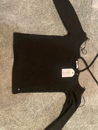 Top de punto negro con diseño moderno y atrevido. Nuevo en perfecto estado - Manga larga. - Escote pronunciado con abertura. - Lazos largos para atar.