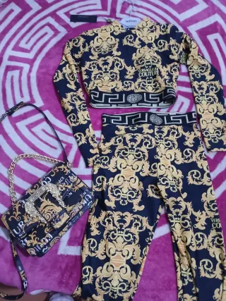 Conjunto de dos piezas con un llamativo estampado. TALLA M pero es como una S - Crop top de manga larga. - Pantalón ajustado. - Diseño barroco en negro y dorado. ENTREGA A MANO