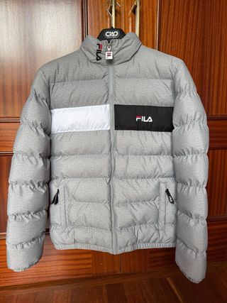 Chaqueta acolchada de la marca Fila como nueva. Cuidada y lista para estrenar de nuevo. Perfecta para quien quiera una prenda top sin pagar precio de tienda. - Color gris con detalles en blanco y negro. - Logo de Fila en el pecho. - Cremallera frontal. - Bolsillos laterales con cremallera. - Ideal para frío, lluvia y looks streetwear. Medidas: Largo: 64cm Ancho pecho: 52cm Largo de manga: 64cm