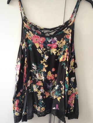 Top de tirantes con mangas largas, estampado de flores y parte de abajo de encaje. Color: negro Marca: Bershka Talla: S Estado: nuevo, sin estrenar