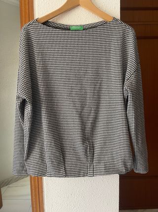 Top manga larga, entallado en la cintura pero con vuelo en la parte baja, un poco elástico, color blanco y negro ( para de gallo)